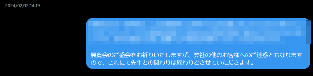 (当該人物と当方のやり取りは上記の文言で終わっています。弊社はお取引を2月いっぱいで打ち切らせていただくとお伝えしただけで、展覧会を中止して欲しいとは一言も申し上げておりません。念のため)