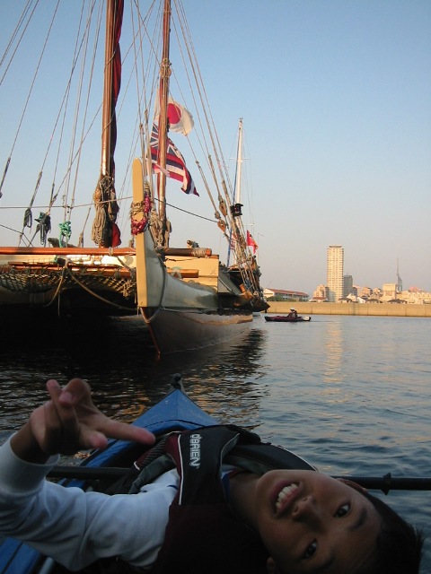 福岡に到着したホクレアの画像です。なんとシーカヤックでホクレアのデッキ下に潜入するという、空前の特撮画像まで!