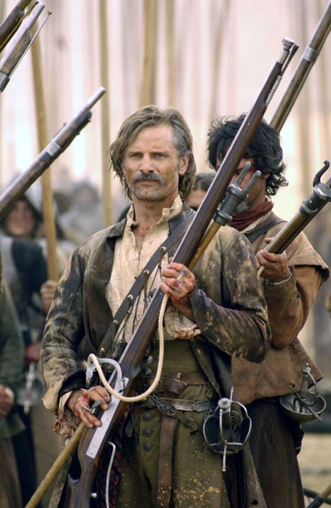 まず隊長が小銃と一緒に持っている、先が二股に割れた棒に注目してください。これ、叉杖(さじょう)と言います。銃を撃つ際には地面に突き立てて、銃身を載せます。モノポッドの一種ですな。銃火器にはこの手のグッズ、結構使うんですよ。機関銃はトライポッド=三脚に置きますし、現代の狙撃銃はバイポッド=二脚を銃身に付けて、伏射で使うことが多いです。なんたって銃身が安定しますから、当たりやすくなるんですよ。ちなみに、叉杖を使わない小型軽量の銃もありました。歴史的にはそちらの方が古いのですが、命中精度やストッピングパワー(対人殺傷力)を向上させた結果、火縄銃はより大きく重い方向に発展しました。これをマスケット銃と言います。邦訳では小さい方を「火縄銃」、大きい方を「マスケット銃」と表記しています(これは私の判断ではないです)。