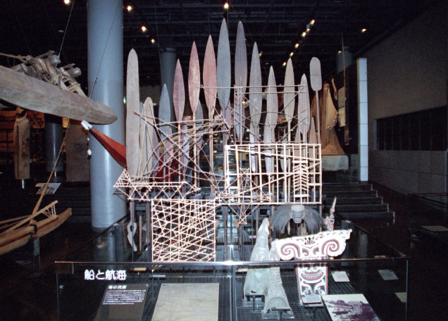 民博の誘惑(その3) 2005.09.26 今日は、ミクロネシアで使われている、伝統航海術の学習用の海図の画像です。 民博では2カ所に展示しておりました。2枚目の写真の後ろに見えるのは、ニューギニアのパドルです。ニューギニアのパドルは表面が非常に美しい彫刻を施されていて、これはこれで見応えがありますよ。
