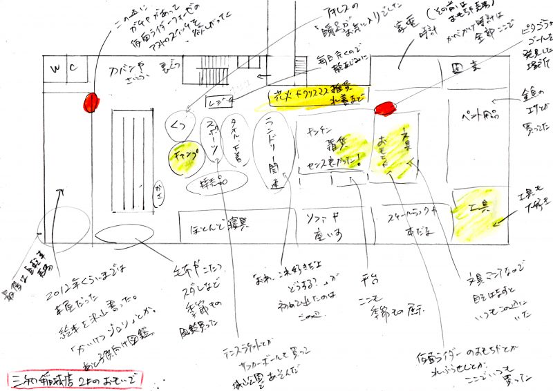 眼鏡屋は本屋の跡地に横移動(今も健在である)。オレンジ色の部分は後々にずっと繋がる「出会い」があった場所で、仮面ライダーは今に至るまでずっと好きですし、ピタゴラゴールの玩具は「こんなものよりどうせならプログラミング出来るものを買おうぜ」という話から、今のPC/プログラミング/ゲームマニアへの道が開けた場所。
